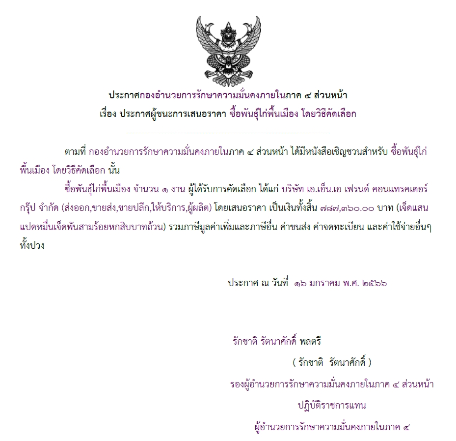 จัดซื้อ จัดจ้างประกาศผู้ชนะการเสนอราคา ประกาศผู้ชนะการเสนอราคา ซื้อพันธุ์ไก่พื้นเมือง โดยวิธีคัดเลือก January 26, 2023 453 Share Facebook Twitter Google+ Telegram LINE