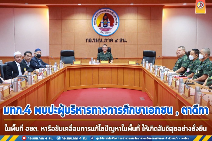 สำหรับกิจกรรม “พบปะผู้อำนวยการสำนักงานการศึกษาเอกชนในพื้นที่จังหวัดชายแดนภาคใต้” นั้น กองอำนวยรักษาความมั่นคงภายในภาค 4 ส่วนหน้า จัดขึ้น เพื่อเปิดโอกาสให้ผู้บริหารสถานศึกษาผู้ที่มีบทบาทสำคัญในการปลูกฝัง อบรม สั่งสอนเยาวชนของชาติ เพื่อให้น้องๆ เยาวชนเติบโตเป็นบุคลากรที่ดีของสังคมและประเทศชาติต่อไปในอนาคต ตลอดจนเพื่อให้ผู้บริหารสถานศึกษาได้รับทราบนโยบายการแก้ไขปัญหาในพื้นที่จังหวัดชายแดนภาคใต้ ของ กองอำนวยการรักษาความมั่นคงภายในภาค 4 ส่วนหน้า เพื่อวางกรอบนโยบายด้านการศึกษาให้สามารถดำเนินการคู่ขนานกับงานด้านความั่นคงในพื้นที่จังหวัดชายแดนภาคใต้ อีกทั้งเปิดรับฟังความคิดเห็น ปัญหา และข้อเสนอแนะ ที่ต้องการให้ กองอำนวยการรักษาความมั่นคงภายในภาค 4 ส่วนหน้า สนับสนุนแก้ไขปัญหาจากผู้บริหารสถานศึกษา ทุกระดับ เพื่อส่งเสริมความร่วมมือระหว่างกัน อันเป็นการขับเคลื่อนงานร่วมกันในทุกมิติ เพื่อให้เกิดความรัก ความเข้าใจ ความสามัคคีของชุมชนและสังคม อันเป็นการร่วมกันสร้างสันติสุขให้เกิดขึ้นในพื้นที่ได้อย่างยั่งยืน