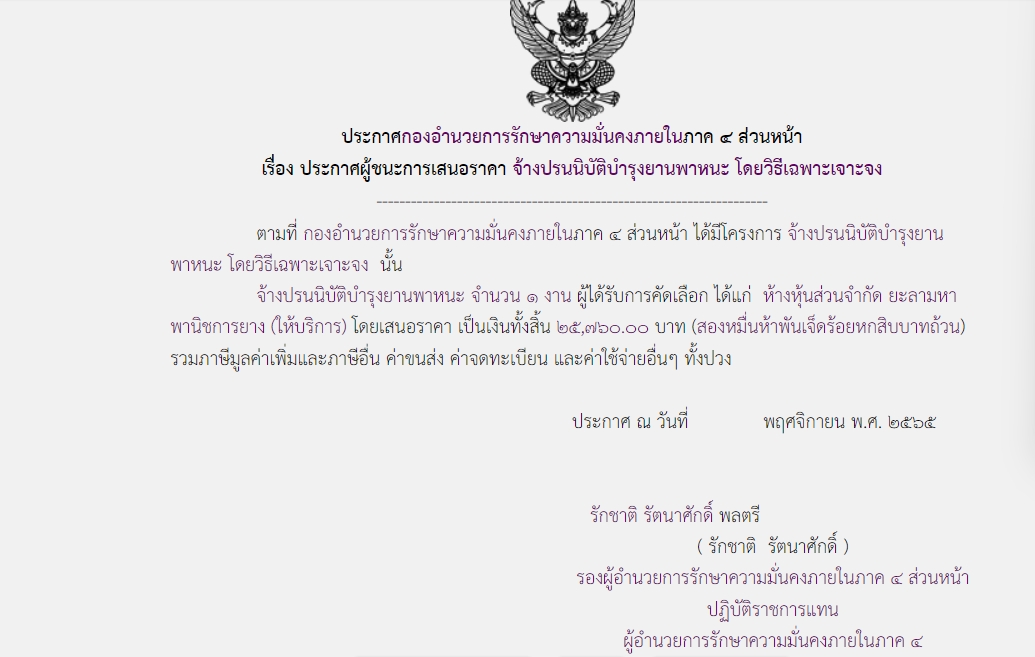 ประกาศผู้ชนะการเสนอราคา จ้างปรนนิบัติบำรุงยานพาหนะ โดยวิธีเฉพาะเจาะจง