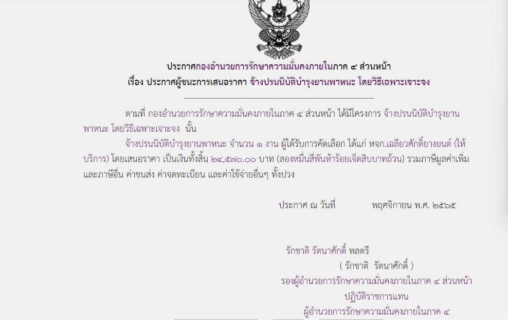 ประกาศผู้ชนะการเสนอราคา จ้างปรนนิบัติบำรุงยานพาหนะ โดยวิธีเฉพาะเจาะจง