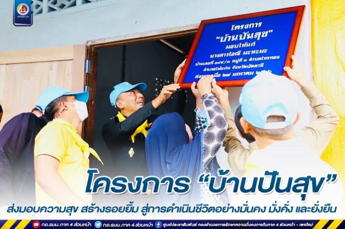 โดยโครงการ “บ้านปันสุข” นั้น เป็นความร่วมมือระหว่าง กองอำนวยการรักษาความมั่นคงภายในภาค 4 ส่วนหน้า และหน่วยเฉพาะกิจปัตตานี ในการสนับสนุนงบประมาณดำเนินการก่อสร้าง โดยมอบหมายให้ หน่วยเฉพาะกิจกรมทหารพรานที่ 44 เป็นหน่วยดำเนินการสร้างบ้านร่วมกับ ส่วนราชการท้องถิ่น และประชาชนในพื้นที่อำเภอไม้แก่น เพื่อให้ นางไอณี มะหะมะ และครอบครัว มีบ้านเป็นของตนเอง มีบ้านที่มั่นคง และเป็นการช่วยเหลือบรรเทาความเดือดร้อนส่งผลให้มีคุณภาพชีวิตความเป็นอยู่ให้ดีขึ้น ทั้งนี้ ผู้บัญชาการมณฑลทหารบกที่ 46 / ผู้บังคับหน่วยเฉพาะกิจปัตตานี พร้อมด้วย ส่วนราชการพลเรือน ทหาร ตำรวจ ผู้นำท้องถิ่น ผู้นำท้องที่ ได้สนับสนุนอุปกรณ์ไฟฟ้าเพื่อเป็นของขวัญขึ้นบ้านใหม่และเป็นกำลังใจให้แก่ครอบครัวในการดำเนินชีวิตต่อไปอย่างปกติสุข สู่ความมั่นคง มั่งคั่ง และยั่งยืน