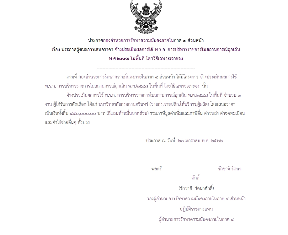 จัดซื้อ จัดจ้างประกาศผู้ชนะการเสนอราคา ประกาศผู้ชนะการเสนอราคา จ้างประเมินผลการใช้ พ.ร.ก. การบริหารราชการในสถานการณ์ฉุกเฉิน พ.ศ.๒๕๔๘ ในพื้นที่ โดยวิธีเฉพาะเจาะจง January 29, 2023 345 Share Facebook Twitter Google+ Telegram LINE