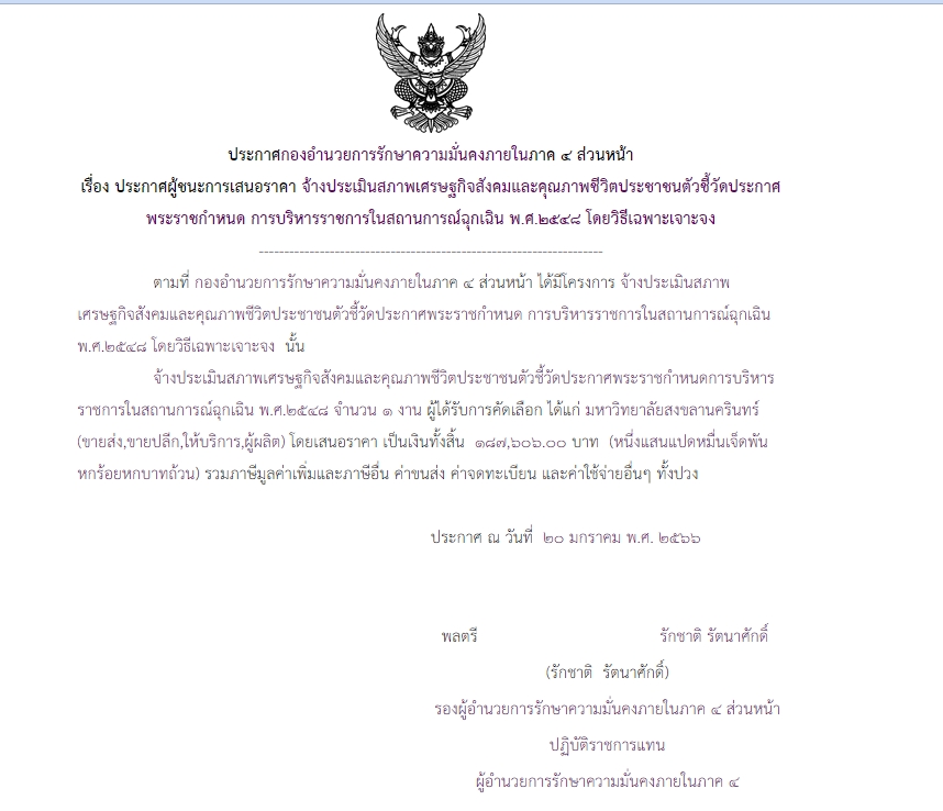 จัดซื้อ จัดจ้างประกาศผู้ชนะการเสนอราคา ประกาศผู้ชนะการเสนอราคา จ้างประเมินสภาพเศรษฐกิจสังคมและคุณภาพชีวิตประชาชนตัวชี้วัดประกาศพระราชกำหนด การบริหารราชการในสถานการณ์ฉุกเฉิน พ.ศ.๒๕๔๘ โดยวิธีเฉพาะเจาะจง January 29, 2023 535 Share Facebook Twitter Google+ Telegram LINE