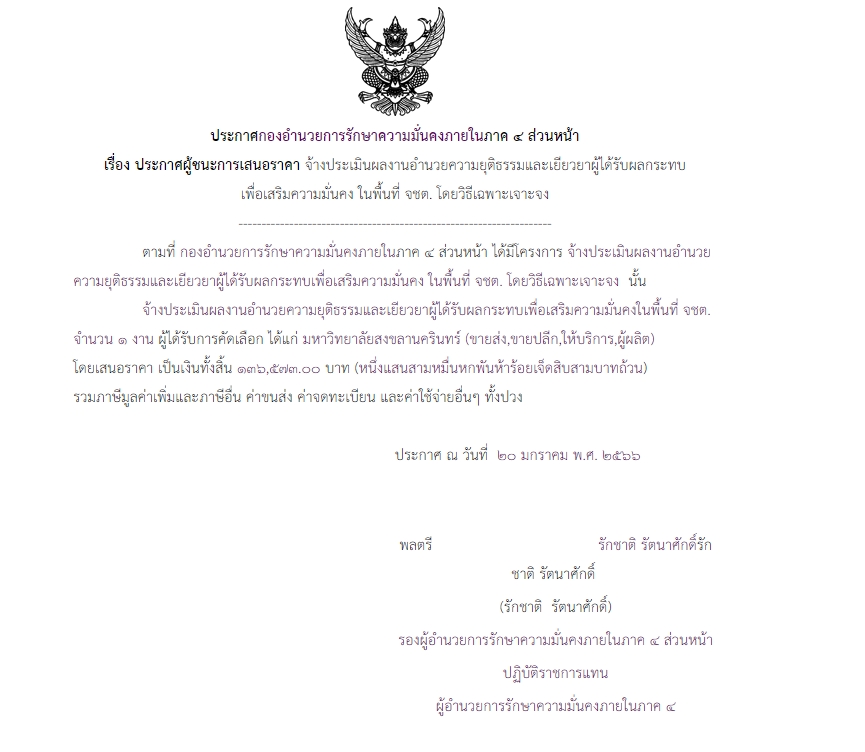 จัดซื้อ จัดจ้างประกาศผู้ชนะการเสนอราคา ประกาศผู้ชนะการเสนอราคา จ้างประเมินผลงานอำนวยความยุติธรรมและเยียวยาผู้ได้รับผลกระทบเพื่อเสริมความมั่นคง ในพื้นที่ จชต. โดยวิธีเฉพาะเจาะจง January 29, 2023 425 Share Facebook Twitter Google+ Telegram LINE