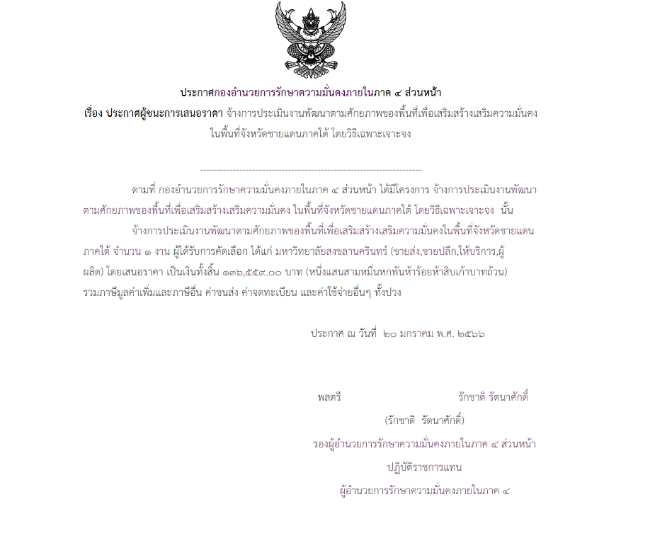 จัดซื้อ จัดจ้างประกาศผู้ชนะการเสนอราคา ประกาศผู้ชนะการเสนอราคา จ้างประเมินงานพัฒนาตามศักยภาพของพื้นที่เพื่อเสริมสร้างเสริมความมั่นคง ในพื้นที่จังหวัดชายแดนใต้ โดยวิธีเฉพาะเจาะจง January 29, 2023 324 Share Facebook Twitter Google+ Telegram LINE