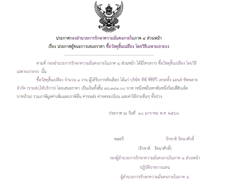 ประกาศผู้ชนะการเสนอราคา ซื้อวัสดุสิ้นเปลือง โดยวิธีเฉพาะเจาะจง
