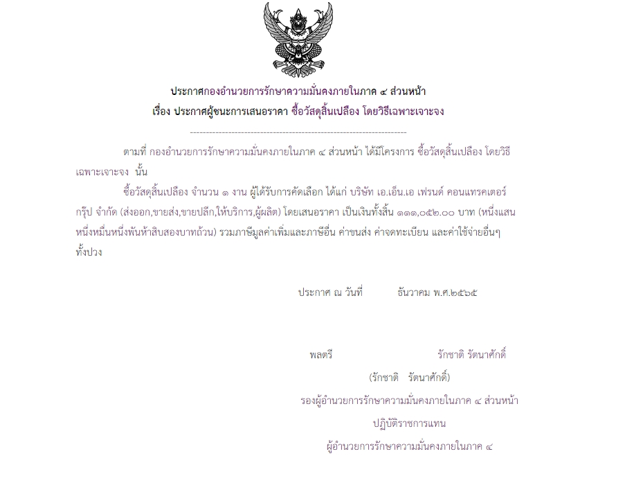 ประกาศผู้ชนะการเสนอราคา ซื้อวัสดุสิ้นเปลือง โดยวิธีเฉพาะเจาะจง