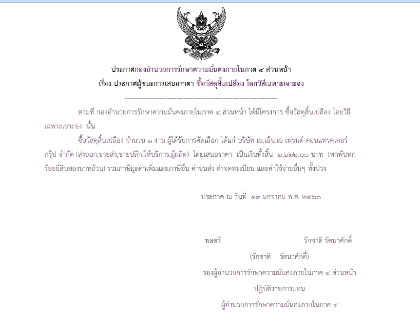 ประกาศผู้ชนะการเสนอราคา ซื้อวัสดุสิ้นเปลือง โดยวิธีเฉพาะเจาะจง