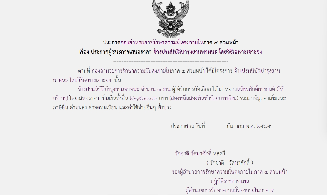 ประกาศผู้ชนะการเสนอราคา จ้างปรนนิบัติบำรุงยานพาหนะ โดยวิธีเฉพาะเจาะจง