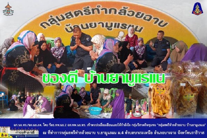 ทั้งนี้ กลุ่มวิสาหกิจชุมชน “กลุ่มสตรีทำกล้วยฉาบ บ้านยามูแรแน” เป็นกลุ่มชาวบ้านสตรีในพื้นที่มีสมาชิกในกลุ่มจำนวน 15 คน โดยรวมตัวกันนำกล้วยหักมุกและกล้วยหิน ซึ่งเป็นวัตถุดิบที่มีในพื้นที่นำมาผลิตกล้วยฉาบเรียกว่า “กล้วยกรอบแก้ว” เพื่อเป็นอาชีพเสริมให้กับครอบครัวและเป็นการสร้างรายได้ให้กับชุมชน ซึ่งผู้บังคับกองร้อยทหารพรานนาวิกโยธินที่ 2 ได้เข้าพบปะเยี่ยมเยียนและพูดคุยให้กำลังใจ กลุ่มสตรีกลุ่มดังกล่าว พร้อมทั้งเป็นการประชาสัมพันธ์ และการให้ความสำคัญส่งเสริมบทบาทของสตรีในพื้นที่