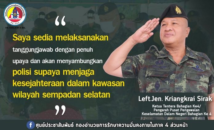 ประชาสัมพันธ์ข่าวประชาสัมพันธ์ “Saya sedia melaksanakan tanggungjawab dengan penuh upaya dan akan menyambungkan polisi supaya menjaga kesejahteraan dalam kawasan wilayah sempadan selatan” October 3, 2020 1177 Share Facebook Twitter Google+ Telegram LINE Left.Jen. Kriangkrai Sirak Ketua Tentera Bahagian Ke4/ Pengarah Pusat Pengawalan Keselamatan Dalam Negeri Bahagian Ke 4