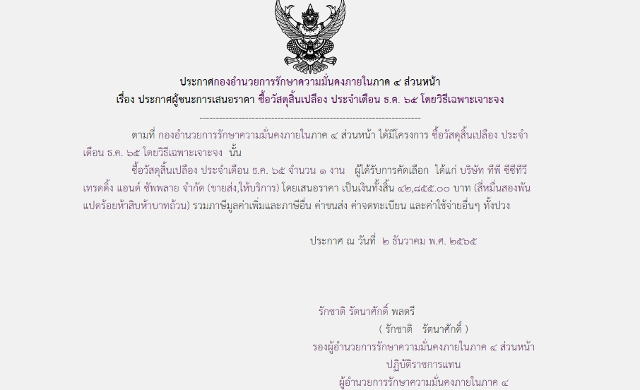ประกาศผู้ชนะการเสนอราคา ซื้อวัสดุสิ้นเปลือง ประจำเดือน ธ.ค. ๖๕ โดยวิธีเฉพาะเจาะจง