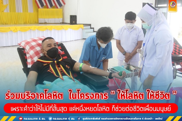 ทั้งนี้มียอดกำลังพลมาร่วมบริจาคโลหิต จำนวน 40 นาย โดยได้รับปริมาณโลหิต จำนวน 18,000 ซีซี, เพื่อสนับสนุนให้กับโรงพยาบาลต่างๆ ที่ขาดแคลนโลหิตในการรักษาโรคผู้ป่วยต่อไป