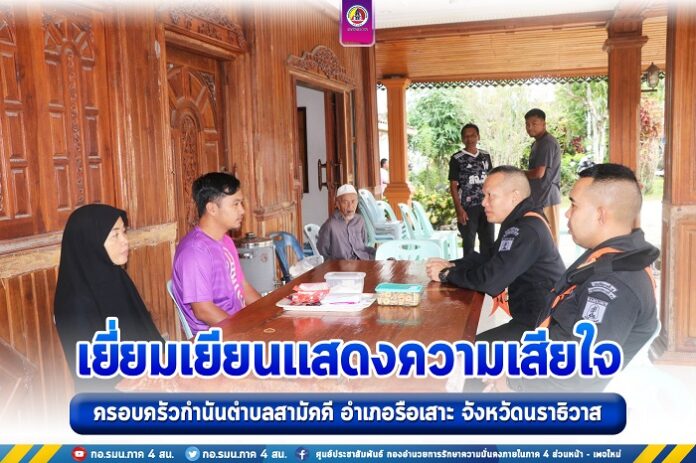 เมื่อวันที่ 30 มกราคม 2566 เวลา 10.00 น. ณ หมู่ที่ 2 บ้านมะนังปันยัง ตำบลสามัคคี อำเภอรือเสาะ จังหวัดนราธิวาส พันเอก สิทธิชัย บำรุงเขต ผู้บังคับหน่วยเฉพาะกิจกรมทหารพรานที่ 46 เข้าพบปะเยี่ยมให้กำลังใจแสดงความเสียใจต่อครอบครัวของ นายซอมารี ฮูซี กำนันตำบลสามัคคี ซึ่งเสียชีวิตด้วยโรคหัวใจล้มเหลว เพื่อสร้างความสัมพันธ์อันดีระหว่างเจ้าหน้าที่รัฐ และประชาชนในพื้นที่ ทั้งนี้ ผู้บังคับหน่วยเฉพาะกิจกรมทหารพรานที่ 46 ยังได้มอบเงิน และข้าวสาร 1 กระสอบ เพื่อเสริมสร้างขวัญกำลังใจต่อครอบครอบดังกล่าว