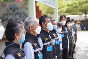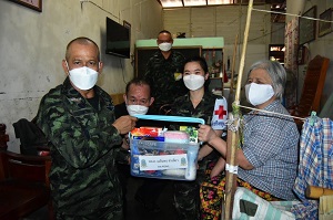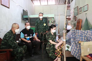 จากนั้น พลตรี เฉลิมพร ขำเขียว ผู้อำนวยการศูนย์ประสานงานโครงการอันเนื่องมาจากพระราชดำริ และคณะ ได้เข้าเยี่ยมเยียนให้กำลังใจ ผู้ป่วยติดเตียง จำนวน 2 รายได้แก่ 1.นางศิริพร แซ่ฟุ้ง อายุ 72 ปี อาศัยอยู่บ้านเลขที่ 171 หมู่ที่ 2 ตำบลตาเนาะแมเราะ อำเภอเบตง จังหวัดยะลาและ 2. นายยี่หลิน แซ่ฉิน อายุ 80 ปี อาศัยอยู่บ้านเลขที่ 214 หมู่ที่ 2 ตำบลตาเนาะแมเราะ อำเภอเบตง จังหวัดยะลาโดยได้พูดคุยสอบถามอาการ สภาพความเป็นอยู่ พร้อมมอบหมายหน่วยงานรับผิดชอบ เข้าสนับสนุนส่งเสริมแนวทางการพัฒนาคุณภาพชีวิต โดยศูนย์ประสานงานโครงการอันเนื่องมาจากพระราชดำริ ได้เล็งเห็นถึงความสำคัญ ของผู้ป่วยติดเตียง ผู้สูงอายุ ผู้ยากไร้ และผู้พิการ ซึ่งต้องตกอยู่ในภาวะลำบาก โดยเฉพาะชาวบ้านในพื้นที่ห่างไกลตัวเมือง ที่ไม่สามารถเดินทางออกมารับความช่วยเหลือจากหน่วยงานทั้งภาครัฐ และเอกชน จึงได้ลงพื้นที่ไปมอบความห่วงใย และมอบกระเช้ายังชีพเครื่องอุปโภค บริโภค เพื่อสร้างขวัญและกำลังใจ พร้อมทั้งเพื่อเป็นการแบ่งเบาภาระค่าครองชีพ ของพี่น้องประชาชนในพื้นที่ต่อไป