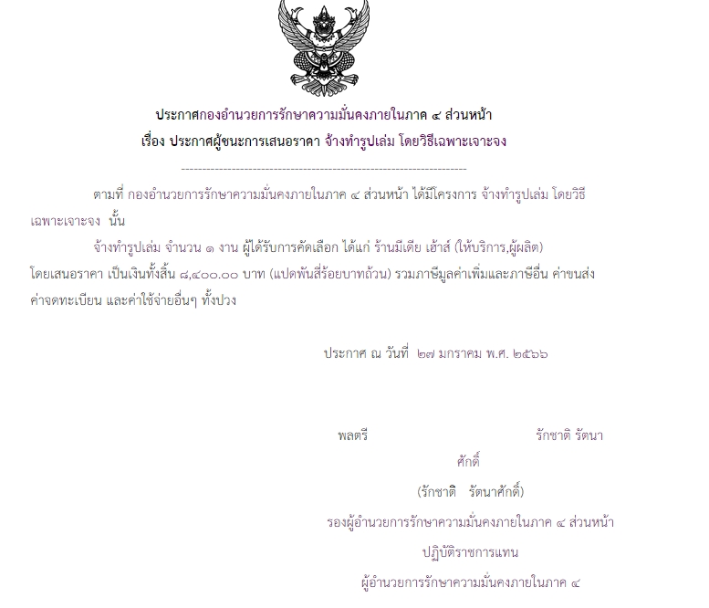 ประกาศผู้ชนะการเสนอราคา จ้างทำรูปเล่ม โดยวิธีเฉพาะเจาะจง