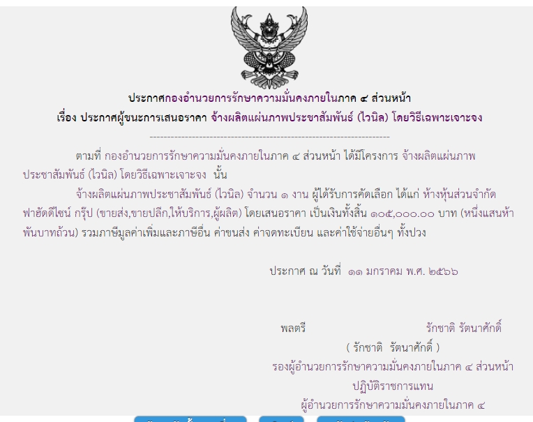 ประกาศผู้ชนะการเสนอราคา จ้างผลิตแผ่นภาพประชาสัมพันธ์ (ไวนิล) โดยวิธีเฉพาะเจาะจง