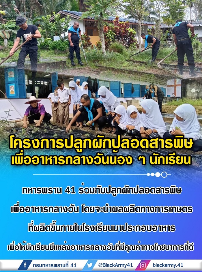 เมื่อวันที่ 6 กุมภาพันธ์ 2566 ที่ โรงเรียนบ้านคีรีบูรวัฒนา หมู่ที่ 5 ตำบลยะต๊ะ อำเภอรามัน จังหวัดยะลา ชุดปฏิบัติการเสริมสร้างความเข้าใจ กองร้อยทหารพรานที่ 4107 หน่วยเฉพาะกิจกรมทหารพรานที่ 41 ร่วมกับบุคลากรทางการศึกษา และนักเรียน จัดกิจกรรม โครงการปลูกผักปลอดสารพิษ เพื่ออาหารกลางวัน โดยจะนำผลผลิตทางการเกษตรที่ผลิตขึ้นภายในโรงเรียนมาประกอบอาหาร เพื่อให้นักเรียนมีแหล่งอาหารกลางวันที่มีคุณค่าทางโภชนาการที่ดี และลดต้นทุนในการหาซื้อวัตถุดิบ