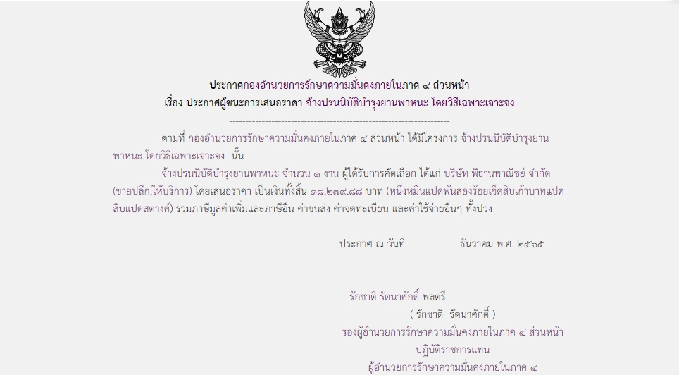 ประกาศผู้ชนะการเสนอราคา จ้างปรนนิบัติบำรุงยานพาหนะ โดยวิธีเฉพาะเจาะจง