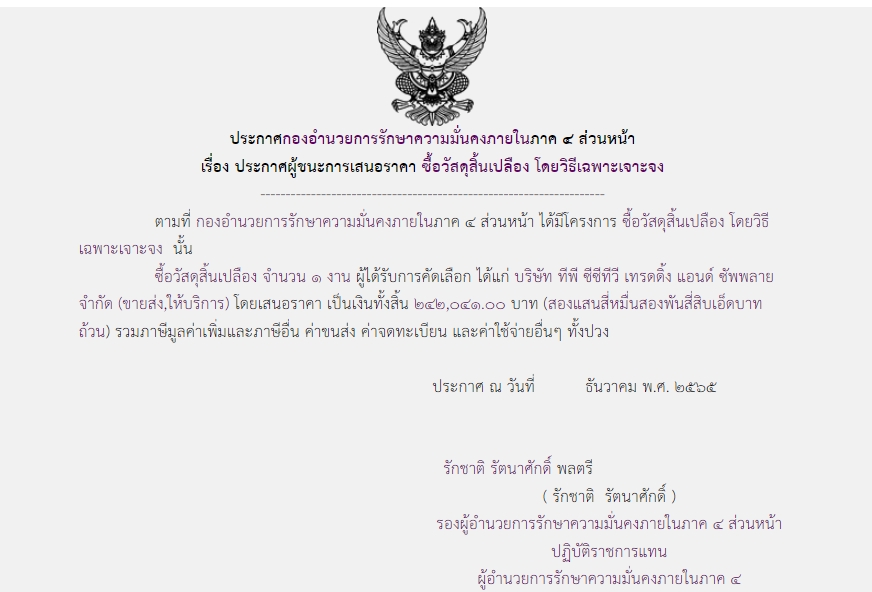 ประกาศผู้ชนะการเสนอราคา ซื้อวัสดุสิ้นเปลือง โดยวิธีเฉพาะเจาะจง