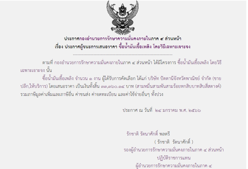 ประกาศผู้ชนะการเสนอราคา ซื้อน้ำมันเชื้อเพลิง โดยวิธีเฉพาะเจาะจง