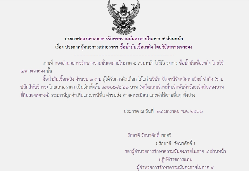 ประกาศผู้ชนะการเสนอราคา ซื้อน้ำมันเชื้อเพลิง โดยวิธีเฉพาะเจาะจง