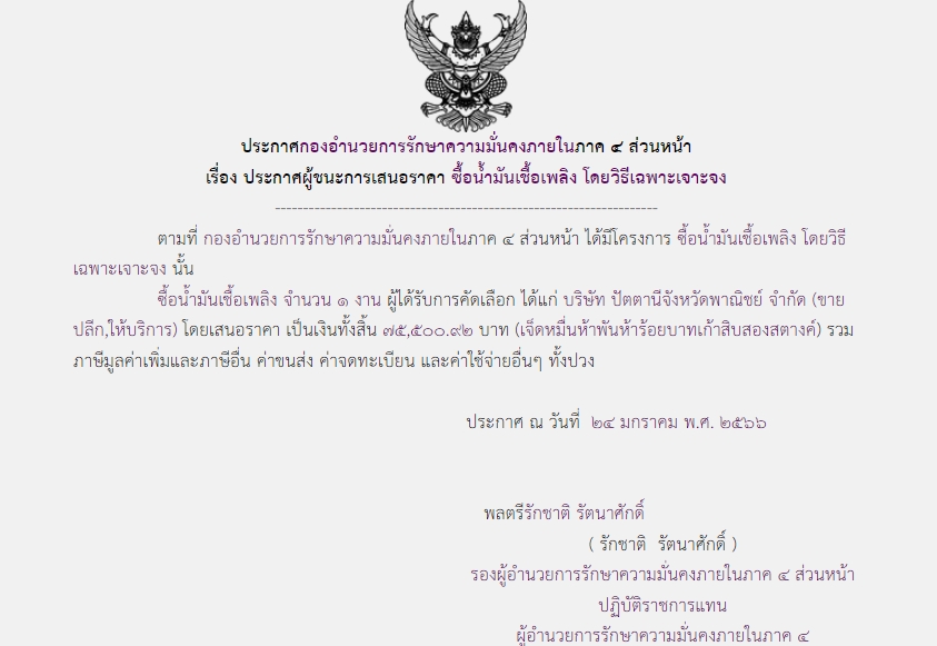 ประกาศผู้ชนะการเสนอราคา ซื้อน้ำมันเชื้อเพลิง โดยวิธีเฉพาะเจาะจง
