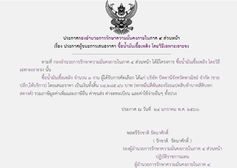 ประกาศผู้ชนะการเสนอราคา ซื้อน้ำมันเชื้อเพลิง โดยวิธีเฉพาะเจาะจง