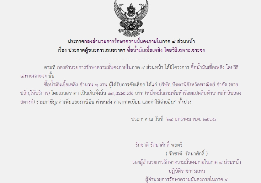 ประกาศผู้ชนะการเสนอราคา ซื้อน้ำมันเชื้อเพลิง โดยวิธีเฉพาะเจาะจง