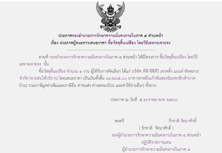 ประกาศผู้ชนะการเสนอราคา ซื้อวัสดุสิ้นเปลือง โดยวิธีเฉพาะเจาะจง