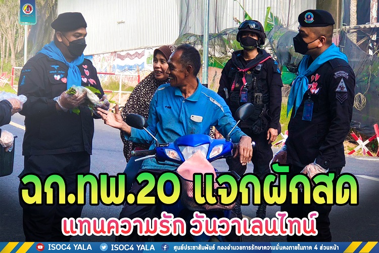 กองร้อยทหารพรานที่ 2011 หน่วยเฉพาะกิจกรมทหารพรานที่ 20 จัดกำลังพล เข้าอุดหนุนผลผลิตทางการเกษตรของเกษตรกรในพื้นที่ หมู่ที่ 2, หมู่ที่ 4, หมู่ที่ 5 ตำบลกอลำ อำเภอยะรัง จังหวัดปัตตานี พร้อมด้วยการนำผลผลิตที่ได้จากการเพาะปลูกของกำลังพลภายในฐาน นำมาแจกจ่ายให้กับประชาชนเป็นของขวัญพิเศษในเทศกาลวันวาเลนไทน์ สร้างความสุข ความประทับใจ แก่ประชาชนเป็นอย่างมาก ที่สำคัญได้ผักสด สะอาด และปลอดภัยไปรับประทานในวันแห่งความรัก ลดภาระค่าใช้จ่ายภายในครัวอีกด้วย