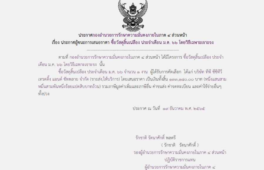 ประกาศผู้ชนะการเสนอราคา ซื้อวัสดุสิ้นเปลือง ประจำเดือน ม.ค. ๖๖ โดยวิธีเฉพาะเจาะจง
