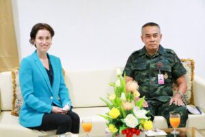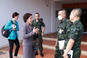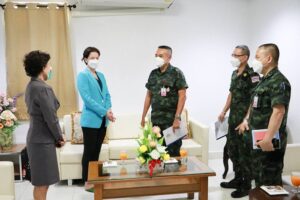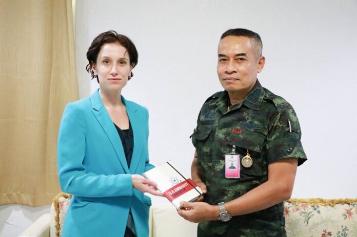 วันนี้ 16 กุมภาพันธ์ 2566 เวลา 13.50 น. ณ ห้องรับรองรวงผึ้ง กองอำนวยการรักษาความมั่นคงภายในภาค 4 ส่วนหน้า ตำบลเขาตูม อำเภอยะรัง จังหวัดปัตตานี พลตรี เฉลิมพงศ์ คงบัว เลขาธิการ กองอำนวยการรักษาความมั่นคงภายในภาค 4 ส่วนหน้า พร้อมคณะ ให้การต้อนรับ (Erin Mahrer, Political Attache) นางสาว เอริน มาเรอร์ ผู้ช่วยเลขานุการด้านการเมือง จากสถานเอกอัครราชทูตสหรัฐอเมริกา ประจำประเทศไทย ซึ่งรับผิดชอบและติดตามสถานการณ์ในพื้นที่จังหวัดชายแดนภาคใต้โดยเฉพาะ พร้อมด้วย นางสาว จันทร์เจ้า จันทร์ศิริ เจ้าหน้าที่ท้องถิ่นประจำสถานเอกอัครราชทูตสหรัฐฯ ในโอกาสเข้าพบเพื่อมารับทราบข้อมูลเกี่ยวกับสถานการณ์ในพื้นที่จังหวัดชายแดนภาคใต้ รวมถึงแนวทางการพัฒนาด้านการเมืองในพื้นที่และความสัมพันธ์ระหว่างชุมชนชาวไทยพุทธกับชาวไทยมุสลิม และการเตรียมการเลือกตั้งในพื้นที่จังหวัดชายแดนภาคใต้ และมารับฟังสอบถามถึงนโยบายแนวทางในการแก้ไขปัญหาจังหวัดชายแดนภาคใต้ของรัฐบาลไทย และการทำงานของกองอำนวยการรักษาความมั่นคงภายในภาค 4 ส่วนหน้า ในการแก้ไขปัญหาพื้นที่จังหวัดชายแดนภาคใต้