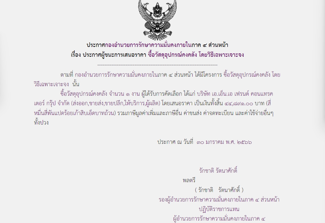 ประกาศผู้ชนะการเสนอราคา ซื้อวัสดุอุปกรณ์คงคลัง โดยวิธีเฉพาะเจาะจง