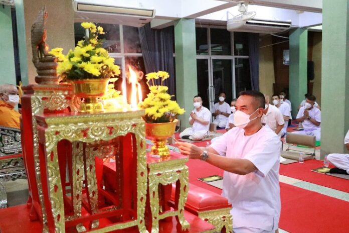 วันนี้ (19 กุมภาพันธ์ 2566) เวลา 19.00 น. ที่ลานปฏิบัติธรรม เขาพระศรีศากยมุณีพุทธโคดม ค่ายสิรินธร ตำบลเขาตูม อำเภอยะรัง จังหวัดปัตตานี พลตรี เฉลิมพงศ์ คงบัว เลขาธิการ กองอำนวยการรักษาความมั่นคงภายในภาค 4 ส่วนหน้า เป็นประธานในกิจกรรมไหว้พระสวดมนต์ ทำวัตรเย็นเจริญจิตภาวนา เนื่องในวันพระ ประจำเดือนกุมภาพันธ์ 2566 เพื่อให้กำลังพลได้ปฏิบัติตนตามแบบพุทธศาสนิกชนที่ดีด้านการสวดมนต์ไหว้พระ รักษาศีลในวันธรรมสวนะ เห็นคุณค่าของหลักธรรมคำสั่งสอนของพระพุทธเจ้า และนำหลักธรรมปรับใช้ในชีวิตประจำวันได้อย่างถูกต้องและเหมาะสม โดยมีกำลังพล และครอบครัว เข้าร่วมกิจกรรมเป็นจำนวนมาก