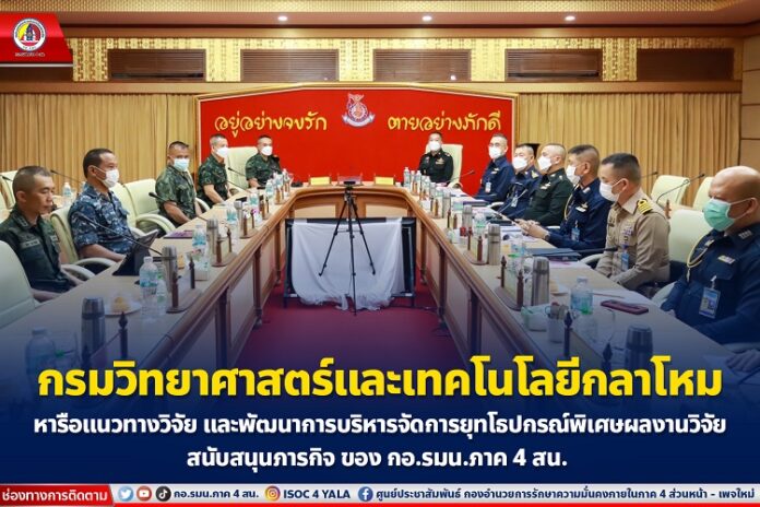 โดยการประชุมในครั้งนี้ เป็นการร่วมหารือในด้านแนวทางการวิจัยและพัฒนาเพื่อสนับสนุนภารกิจของ กองอำนวยการรักษาความมั่นคงภายในภาค 4 ส่วนหน้า แนวทางการบริหารจัดการและซ่อมบำรุงยุทโธปกรณ์พิเศษผลงานวิจัย และแนวทางการให้สิทธิประโยชน์ของนักวิจัยเมื่อลงไปปฏิบัติงานในจังหวัดชายแดนภาคใต้ รวมถึงแนวทางการอนุมัติหลักการให้ใช้สถานที่หน่วยประสานการวิจัยในพื้นที่จังหวัดชายแดนภาคใต้ ตลอดจนติดตามประเมินผลการใช้งานยุทโธปกรณ์พิเศษผลงานวิจัยฯ ที่ผ่านมา ทั้งนี้เพื่อนำผลการประเมินและข้อเสนอแนะต่าง ๆ มาปรับแก้ไขให้งานด้านยุทโธปกรณ์มีคุณภาพ เพื่อปฏิบัติหน้าที่ในการดูแลความปลอดภัยทั้งชีวิตและทรัพย์สินแก่พี่น้องประชาชนตลอดจนกำลังพลให้มีประสิทธิภาพมากยิ่งขึ้น