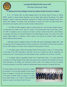 On 21 – 22 February 2023, the Peace Dialogue Panel for the Southern Border Provinces of Thailand (PEDP), headed by General Wanlop Rugsanaoh, and the Patani Malay National Revolutionary Front (BRN) Delegation, headed by Ustaz Anas Abdulrahman, attended the 6th meeting of the Peace Dialogue Process, held in Kuala Lumpur, Malaysia. The meeting, which was facilitated by General Tan Sri Dato’ Seri Zulkifli Zainal Abidin and observed by the experts, achieved a number of positive results as follows: