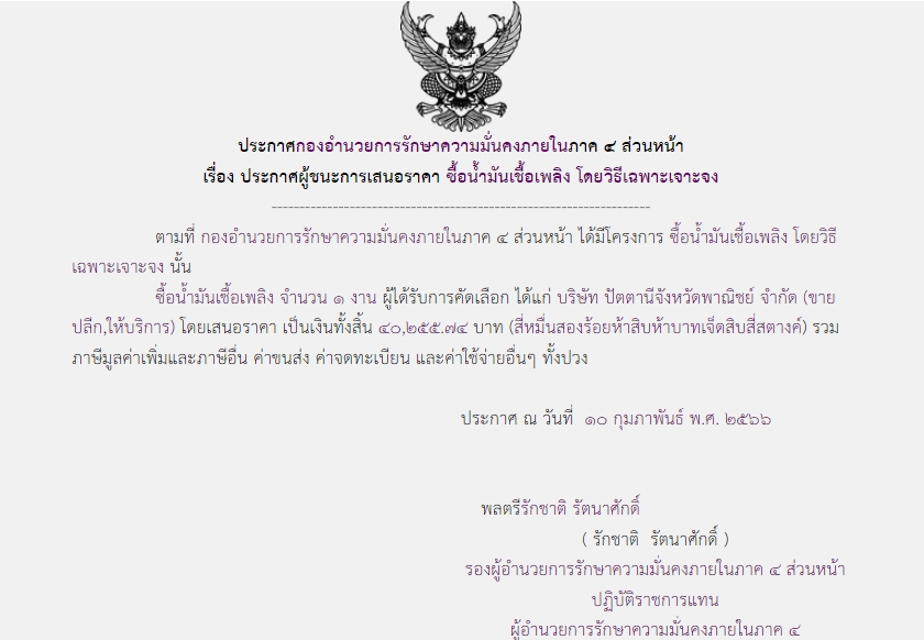 ประกาศผู้ชนะการเสนอราคา ซื้อน้ำมันเชื้อเพลิง โดยวิธีเฉพาะเจาะจง