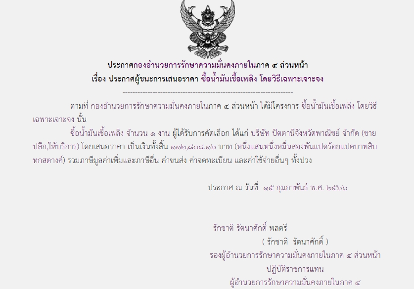 ประกาศผู้ชนะการเสนอราคา ซื้อน้ำมันเชื้อเพลิง โดยวิธีเฉพาะเจาะจง