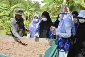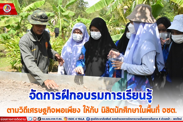 จากนั้น นิสิตนักศึกษา ได้เดินทางเยี่ยมชมศูนย์เกษตรทฤษฎีใหม่ครบวงจร กองพลทหารรอบที่ 15 เพื่อศึกษาเรียนรู้ แนวทางปรัชญาเศรษฐกิจพอเพียง จากการปฏิบัติจริง โดยศูนย์เกษตรทฤษฎีใหม่ครบวงจร กองพลทหารรอบที่ 15 ได้น้อมนำศาสตร์พระราชา ตามแนวทางปรัชญาเศรษฐกิจพอเพียง ของพระบาทสมเด็จพระมหาภูมิพลอดุลยเดชมหาราช บรมนาถบพิตร พร้อมทั้งได้ปฏิบัติตามนโยบายของ พลเอก ณรงค์พันธ์ จิตต์แก้วแท้ ผู้บัญชาการทหารบก ซึ่งสั่งการให้ กรมกิจการพลเรือนกองทัพบก ได้ดำเนินการจัดทำศูนย์เกษตรทฤษฎีใหม่ครบวงจร และศูนย์เกษตรทฤษฎีใหม่ครบวงจรต้นแบบ โดยให้ หน่วยขึ้นตรงกองทัพบก ที่มีศูนย์การเรียนรู้ตามหลักปรัชญาของเศรษฐกิจพอเพียงในพื้นที่ มาจัดทำศูนย์เกษตรทฤษฎีใหม่ครบวงจร เพื่อเป็นสวัสดิการที่ส่งเสริมให้กับกำลังพล และครอบครัว มีรายได้ มีคุณภาพชีวิตที่ดี สามารถพึ่งพาตนเองได้แบบยั่งยืน อีกทั้งส่งเสริมให้ประชาชนรอบพื้นที่ ได้มีส่วนร่วมและน้อมนำหลักปรัชญาของเศรษฐกิจพอเพียงไปประยุกต์ใช้ในชุมชนของตนเองให้มีคุณภาพชีวิตที่ดีขึ้น ประกอบโดย 5 ฐานการเรียนรู้ได้แก่ ฐานที่ 1 คนรักดิน คือ การปลูกป่า 3 ประโยชน์ 4 อย่าง การทำปุ๋ยหมัก, ฐานที่ 2 คนรักน้ำ คือ การดูแลอย่าให้น้ำเน่าเสีย สามารถนำมาสัตว์ได้ ,ฐานที่ 3 คนรักแม่โพสพ คือ การปลูกข้าวพระราชทานแปลงนาสาธิต, ฐานที่ 4 คนเอาถ่าน คือ การทำถ่านเพื่อใช้ในการหุงต้มภายในครัวเรือน และสามารถนำน้ำส้มควันไม้ไปใช้ประโยชน์รดพืชผัก และฐานที่ 5 คนมีน้ำยา คือ การทำน้ำจุลินทรีย์ เพื่อนำไปใช้กับพืชผักสวนครัว เป็นต้น