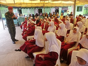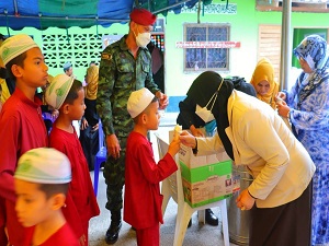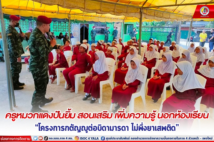 วันนี้ (26 กุมภาพันธ์ 2566) ที่ ศูนย์การศึกษาอิสลามประจำมัสยิดอิสลาฮูดีน (โรงเรียนตาดีกาบ้านยานิง) หมู่ที่ 2 ตำบลจวบ อำเภอเจาะไอร้อง จังหวัดนราธิวาส หน่วยเฉพาะกิจสันติสุข โดยชุดสันติสุขที่ 403 ร่วมกับชุดทักษิณสัมพันธ์ 402 และ ชุดเสริมสร้างความเข้าใจหญิง หมวดทหารพรานหญิง หน่วยเฉพาะกิจกรมทหารพรานที่ 48 ได้ดำเนินการร่วมกันจัด “โครงการกตัญญูต่อบิดามารดาไม่พึ่งยาเสพติด” เข้าสอนเสริมและเพิ่มความรู้นอกห้องเรียน ให้กับเยาวชนตามสถานศึกษา โดยมี นายมาหะมะยากี หะยีมะ นายอำเภอเจาะไอร้อง เป็นประธานเปิดโครงการ พร้อมด้วยผู้นำท้องที่ ท้องถิ่น ผู้นำศาสนา ส่วนราชการในพื้นที่ ประชาชน ผู้ปกครอง และนักเรียนตาดีกา เข้าร่วมโครงการ