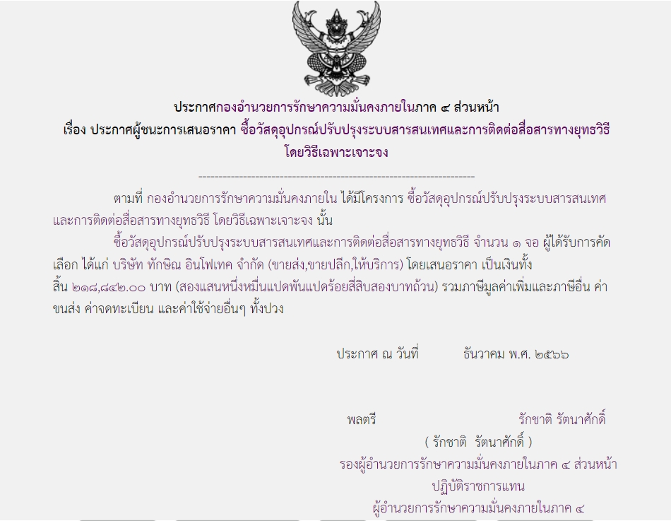 จัดซื้อ จัดจ้างประกาศผู้ชนะการเสนอราคา ประกาศผู้ชนะการเสนอราคา ซื้อวัสดุอุปกรณ์ปรับปรุงระบบสารสนเทศและการติดต่อสื่อสารทางยุทธวิธี โดยวิธีเฉพาะเจาะจง February 27, 2023 383 Share Facebook Twitter Google+ Telegram LINE