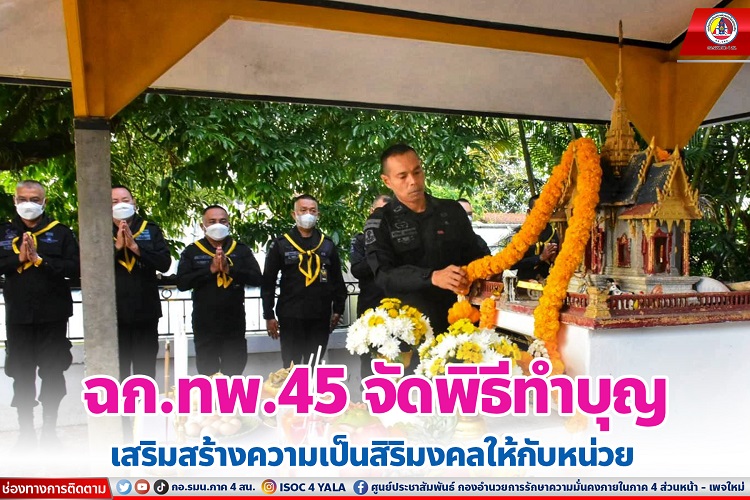 เมื่อวันที่ 26 กุมภาพันธ์ 2566 เวลา 07.09 น. หน่วยเฉพาะกิจกรมทหารพรานที่ 45 จัดกำลังพลของหน่วย ร่วมพิธีทำบุญบำเพ็ญกุศลหน่วย ณ หน่วยเฉพาะกิจกรมทหารพรานที่ 45 ตำบลตันหยงมัส อำเภอระแงะ จังหวัดนราธิวาส เพื่อความเป็นสิริมงคลแก่หน่วยงานและเจ้าหน้าที่ โดยได้จัดพิธีทั้งศาสนาพุทธ และศาสนาอิสลาม โดยมี พันเอก ทวีรัตน์ เบญจาทิกุล ผู้บังคับหน่วยเฉพาะกิจกรมทหารพรานที่ 45 เป็นประธานในพิธีดังกล่าว มีส่วนราชการ เจ้าหน้าที่ในพื้นที่ และกำลังพล ร่วมในพิธีเป็นจำนวนมาก เพื่อความสิริมงคลรับสิ่งดี ๆ เข้ามาสู่ชีวิต