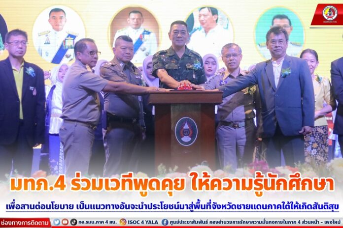 วันนี้ 27 กุมภาพันธ์ 2566 เวลา 09.00 น. ที่ ห้องประชุมใหญ่ มหาวิทยาลัยราชภัฏยะลา อำเภอเมือง จังหวัดยะลา พลโท ศานติ ศกุนตนาค แม่ทัพภาคที่ / ผู้อำนวยการรักษาความมั่นคงภายในภาค 4 พร้อมด้วย 3 ส่วนหน่วยงานภาครัฐ ทหาร ตำรวจ และศูนย์อำนวยการบริหารจังหวัดชายแดนภาคใต้ ร่วมการสัมมนา ในหัวข้อเรื่องปัญหาและการบริหารจัดการพื้นที่จังหวัดชายแดนภาคใต้ โดยหลักสูตรรัฐประศาสนศาสตรบัณฑิต คณะมนุษยศาสตร์และสังคมศาสตร์มหาวิทยาลัยราชภัฏยะลาเพื่อสร้างองค์ความรู้ใหม่ แก่นักศึกษาชั้นปีที่ 3 คณะครูอาจารย์ ได้เกิดประโยชน์สูงสุดต่อสังคม และเป็นแนวทางในการส่งเสริมการแก้ไขปัญหาจังหวัดชายแดนภาคใต้