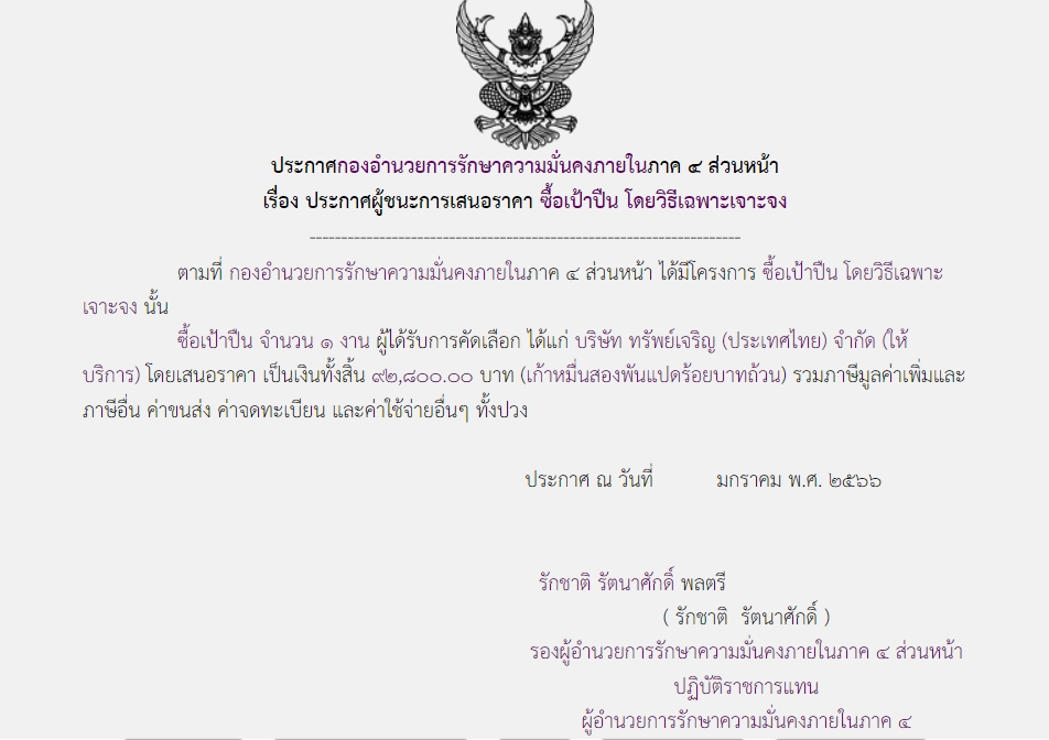 ประกาศผู้ชนะการเสนอราคา ซื้อเป้าปืน โดยวิธีเฉพาะเจาะจง