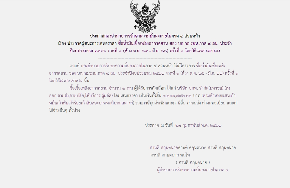 จัดซื้อ จัดจ้างประกาศผู้ชนะการเสนอราคา ประกาศผู้ชนะการเสนอราคา ซื้อน้ำมันเชื้อเพลิงอากาศยาน ของ บก.กอ.รมน.ภาค ๔ สน. ประจำปีงบประมาณ ๒๕๖๖ งวดที่ ๑ (ห้วง ต.ค. ๖๕ – มี.ค. ๖๖) ครั้งที่ ๑ โดยวิธีเฉพาะเจาะจง February 27, 2023 468 Share Facebook Twitter Google+ Telegram LINE