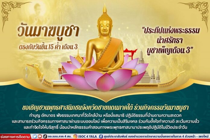 ขอเชิญชวนพุทธศาสนิกชนจังหวัดชายแดนภาคใต้ ร่วมกิจกรรมวันมาฆบูชา ทำบุญ ตักบาตร ฟังธรรมเทศนาที่วัดใกล้บ้าน หรือนั่งสมาธิ ปฏิบัติธรรมที่บ้านตามความสะดวก และสามารถร่วมคิจกรรมทางคาสนาผ่านระบบออนไลน์ เพื่อความเป็นสิริมงคล ร่วมกันตั้งใจทำความดี ละเว้นความชั่ว และทำจิตใจให้บริสุทธิ์ น้อมนำหลักธรรมคำสอนทางพระพุทธศาสนามาประพฤติปฏิบัติในชีวิตประจำวัน