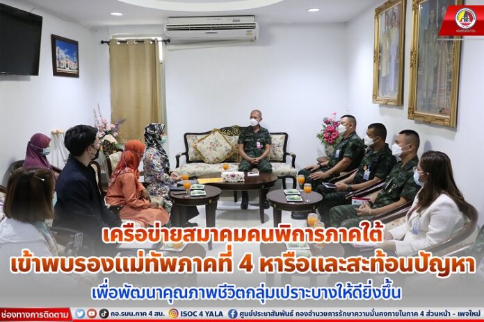 โอกาสนี้ พลตรี กรกฎ ภู่โชติ รองผู้อำนวยการรักษาความมั่นคงภายในภาค 4 ส่วนหน้า กล่าวว่า ยินดี ที่ได้มาพบกับคณะสมาคมคนพิการภาคใต้ ซึ่งทางกองอำนวยการรักษาความมั่นคงภายในภาค 4 ส่วนหน้า (กอ.รมน.ภาค 4 สน.) ขอชื่นชมการปฏิบัติหน้าที่ของคณะกรรมการสมาคมคนพิการภาคใต้ ในการลงพื้นที่ไปช่วยเหลือกลุ่มเปราะบาง ที่ไม่สามารถช่วยเหลือตนเองได้ ซึ่งทางเจ้าหน้าที่ในพื้นที่ไม่ว่าจะเป็น ส่วนราชการที่เกี่ยวข้อง หรือทางผู้นำในพื้นที่ จะต้องให้การช่วยเหลือและให้ความสำคัญกับกลุ่มเปราะบางกลุ่มนี้ เพราะว่ากลุ่มนี้ ไม่สามารถที่จะช่วยเหลือตนเองได้ ซึ่งทางเจ้าหน้าที่จะต้องดูแลและลงพื้นที่สำรวจกลุ่มเปราะบางอย่างจริงจัง ให้รับทราบถึงข้อมูลและปัญหาที่กลุ่มเปราะบางกำลังเผชิญอยู่ ซึ่งทางกองอำนวยการรักษาความมั่นคงภายในภาค 4 ส่วนหน้า (กอ.รมน.ภาค 4 สน.) ร่วมกับศูนย์อำนวยการบริหารจังหวัดชายแดนภาคใต้ (ศอ.บต.) พร้อมผลักดันและช่วยเหลือในการพัฒนาคุณภาพชีวิตกลุ่มเปราะบางให้ดีขึ้น พร้อมทั้งให้หน่วยงานในพื้นที่บูรณาการร่วมกัน เพื่อเข้าช่วยเหลือกลุ่มเปราะบางอย่างดีที่สุด