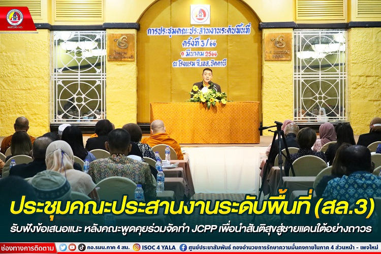 วันนี้ (9 มีนาคม 2566) เวลา 10.30 น. ณ ห้องน้ำพราว 1 โรงแรมซีเอส ปัตตานี อำเภอเมือง จังหวัดปัตตานี พลเอก วัลลภ รักเสนาะ หัวหน้าคณะพูดคุยเพื่อสันติสุขจังหวัดชายแดนภาคใต้ ร่วมประชุมคณะประสานงานระดับพื้นที่ ครั้งที่ 3 ประจำปี 2566 เพื่อขับเคลื่อนงานการสร้างสภาวะแวดล้อมในพื้นที่จังหวัดชายแดนภาคใต้ ให้เอื้อต่อกระบวนการพูดคุยสันติสุข ภายหลังมีการตกลงร่วมกันระหว่างคณะพูดคุยสันติสุขจังหวัดชายแดนภาคใต้ และกลุ่ม BRN ในการจัดทำแผนปฏิบัติการร่วมเพื่อสร้างสันติสุขแบบองค์รวม (Joint Comprehensive Plan towards Peace) หรือ JCPP เมื่อวันที่ 21 – 22 กุมภาพันธ์ 2566 ที่ผ่านมา โดยมี พลโท ศานติ ศกุนตนาค แม่ทัพภาคที่ 4 / ผู้อำนวยการรักษาความมั่นคงภายในภาค 4 ในฐานะหัวหน้าคณะประสานงานระดับพื้นที่ เป็นประธาน พร้อมด้วย พลตรี วรเดช เดชรักษา ผู้บัญชาการกองพลทหารราบที่ 5 / ผู้อำนวยการศูนย์สันติวิธี ในฐานะเลขานุการคณะประสานงานระดับพื้นที่ ตลอดจนคณะประสานงานระดับพื้นที่ทั้ง 3 จังหวัดชายแดนภาคใต้ (ปัตตานี, ยะลา, นราธิวาส) และ 4 อำเภอของจังหวัดสงขลา ร่วมประชุม