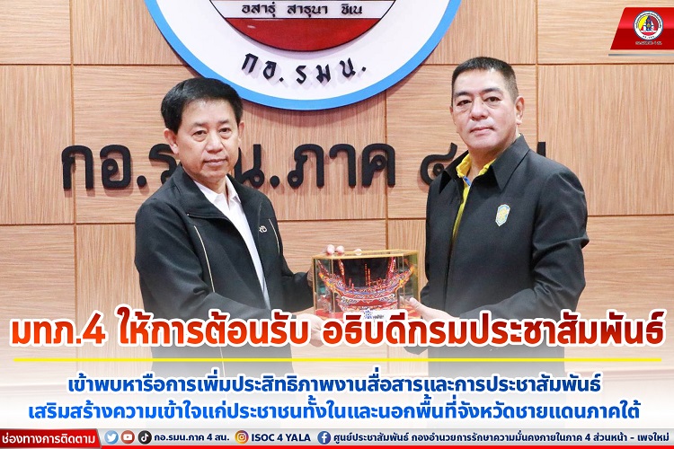 โดย พลโท ศานติ ศกุนตนาค แม่ทัพภาคที่ 4 / ผู้อำนวยการรักษาความมั่นคงภายในภาค 4 กล่าวว่า รู้สึกยินดีที่อธิบดีกรมประชาสัมพันธ์และคณะ ได้เข้าพบเพื่อหารือในเรื่องการเพิ่มประสิทธิภาพเครือข่ายงานสื่อสารสร้างความเข้าใจและการประชาสัมพันธ์ในวันนี้ สำหรับงานด้านการประชาสัมพันธ์ ถือเป็นงาน ที่มีความสำคัญในการสร้างการรับรู้ สร้างความเข้าใจในข้อมูลข่าวสาร และข้อเท็จจริงไปยังพี่น้องประชาชนในพื้นที่จังหวัดชายแดนภาคใต้ ทั้ง 5 จังหวัด ประกอบด้วย จังหวัดสตูล สงขลา ปัตตานี ยะลา และนราธิวาส พร้อมย้ำว่า แนวทางปฏิบัติในการขับเคลื่อนงานด้านเครือข่ายการสื่อสารสร้างความเข้าใจในการแก้ไขปัญหาจังหวัดชายแดนภาคใต้ซึ่งมีส่วนสำคัญยิ่ง และเป็นช่องทางสื่อสารของภาครัฐไปสู่ประชาชนให้เข้าใจการทำงานของภาครัฐ และกองอำนวยการรักษาความมั่นคงภายในภาค 4 ส่วนหน้า พร้อมสนับสนุนและแลกเปลี่ยนข้อมูลข่าวสารร่วมกัน เพื่อสร้างสันติสุขอย่างยั่งยืนในพื้นที่ต่อไป